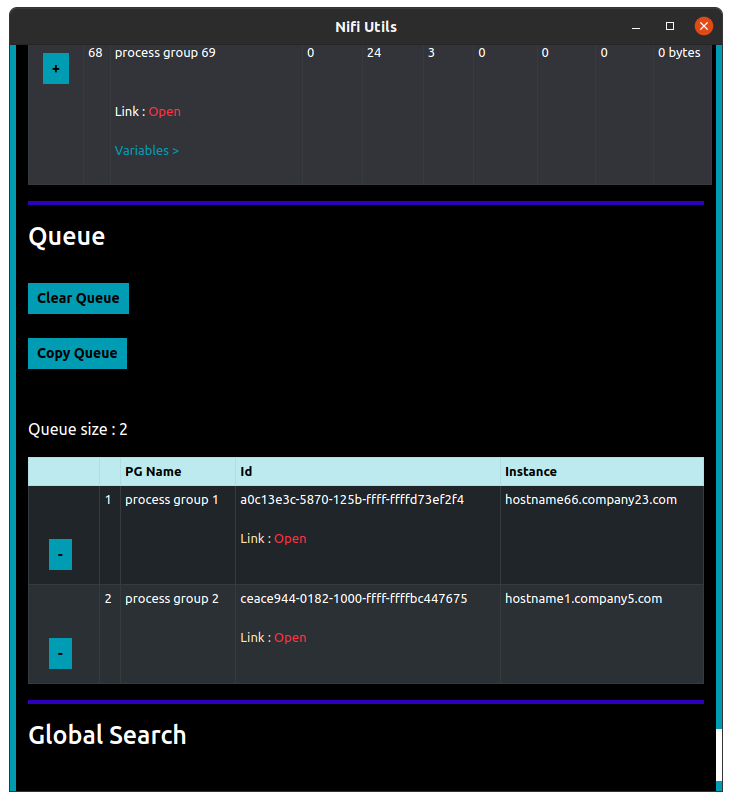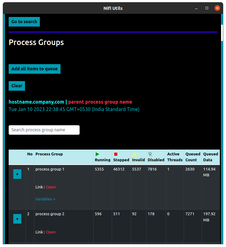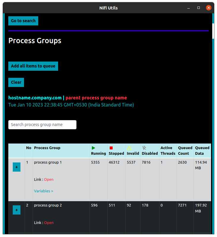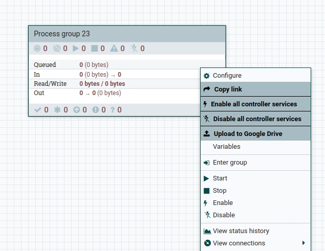 When a logged-in Nifi instance is opened in the currently active tab, the extension injects a content script in that tab, which retrieves the JWT (JSON Web Token) token and hostname of the Nifi instance from the currently active tab to the extension. Then using that token and the instance`s hostname, the extension can retrieve all the process groups present on the Nifi canvas. And they are also cached to view later. Then you can search & sort the fetched process groups based on various filters. You can also bookmark any process group by adding it to the queue. And export the queue as a CSV file. Apart from fetching only what is available on the canvas, you can also search for process groups in the whole Nifi instance. And these search results are also cached to be viewed later. Once any process group is fetched from canvas/searched for, it will available to be directly searched from chrome`s search bar. Anyone working on Nifi 1.13.2 or less can leverage various custom UI components which are directly injected into the Nifi UI. They can help you in enabling/disabling all the controller services at a certain process group level, copy the JWT token using a single click, and back up any of the process groups to your google drive. You can enable any of these custom UI components using the options menu.